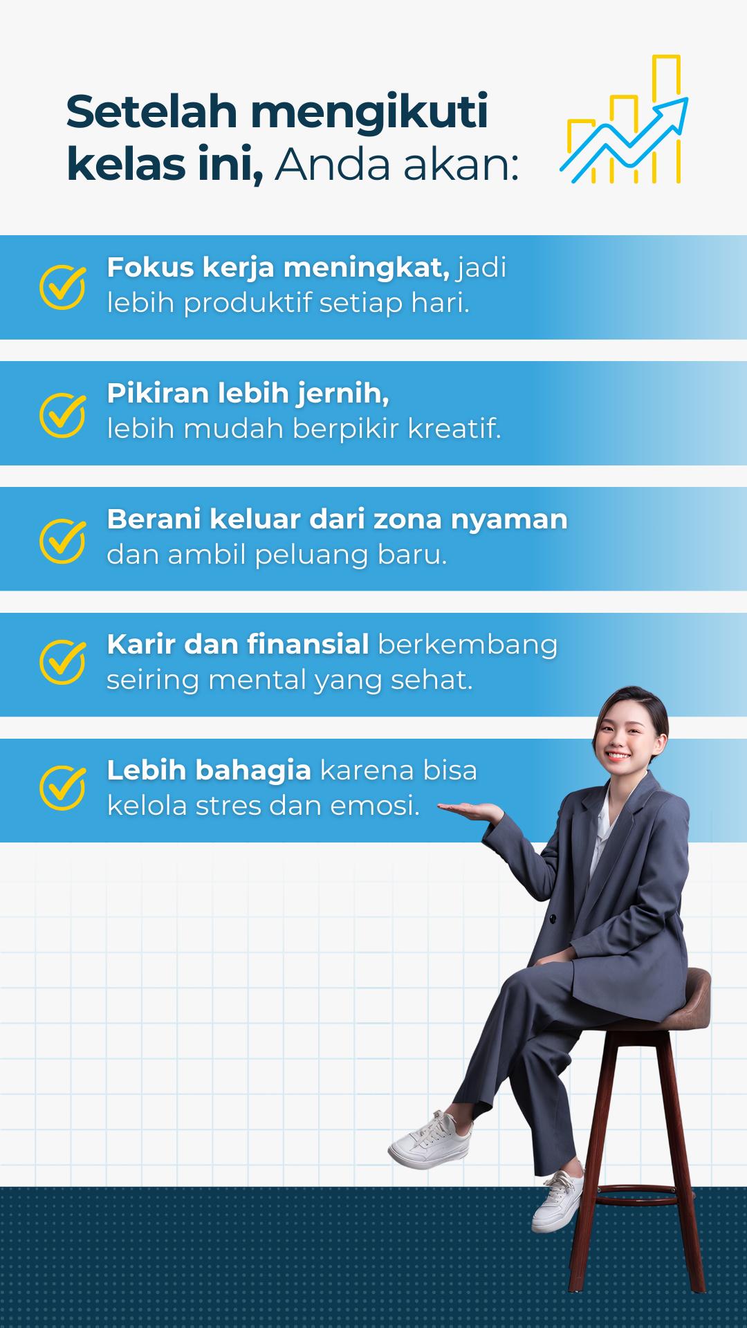 Disini kamu akan belajar teknik ilmiah yang dapat menghilangkan stres agar kamu tetap fokus, dan tampil maksimal di dunia kerja.